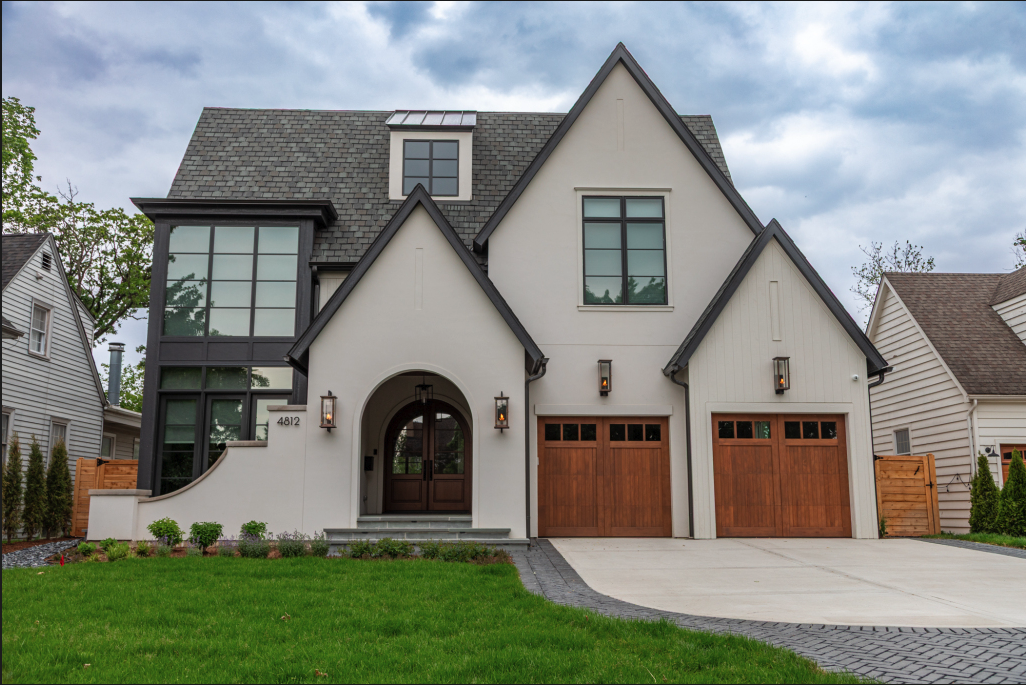 A fresh white exterior, beautifully accented by crisp black trim and a dark roof all blend into classic charm with sleek design. The warm wooden garage doors add a lovely natural touch and plenty of space.